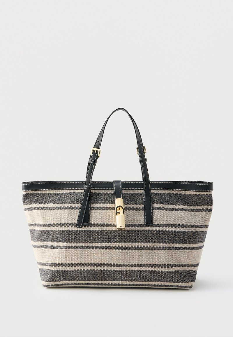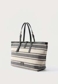 Τσάντα ώμου με μπεζ και μαύρες ρίγες, μαύρες δερμάτινες λαβές και κούμπωμα με χρυσό τόνο, σε λευκό φόντο.