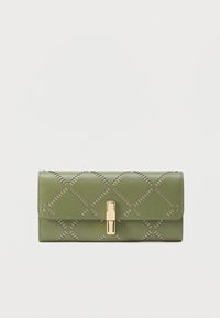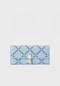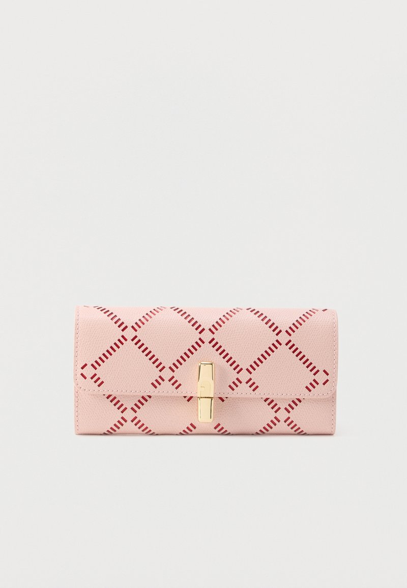 Ανοιχτό ροζ πορτοφόλι με διακοσμητικό μοτίβο σε σχήμα ρόμβου που αποκαλύπτει κόκκινο εσωτερικό, με κεντρικό χρυσό κούμπωμα στην εμπρόσθια πτερύγιο.
