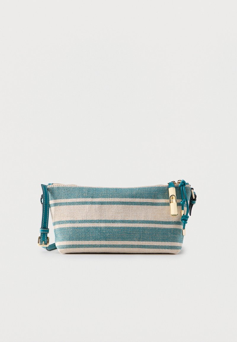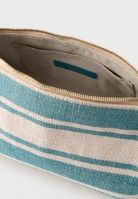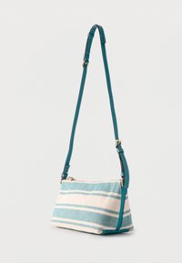 Ορθογώνια υφασμάτινη θήκη με μπλε και λευκές ριγέ, με τιρκουάζ δερμάτινη τσέπη φερμουάρ και ρυθμιζόμενο ιμάντα.