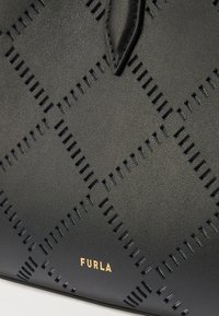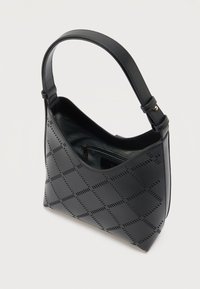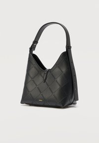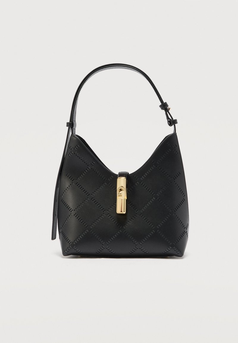 Μαύρη δερμάτινη τσάντα χειρός με ανάγλυφο μοτίβο διαμαντιού, κλείσιμο με χρυσό κούμπωμα και ένα ρυθμιζόμενο ιμάντα ώμου, εμφανιζόμενη σε λευκό φόντο.