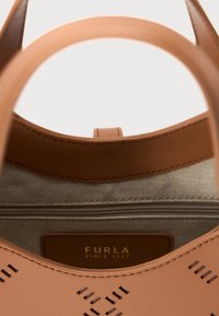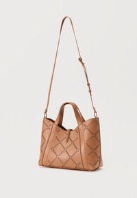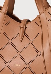 Καφέ δερμάτινη τσάντα χειρός με διάτρητα διαμαντένια σχέδια, χρυσή αγκράφα, δύο κοντές λαβές και ρυθμιζόμενο μακρύ λουρί ώμου.