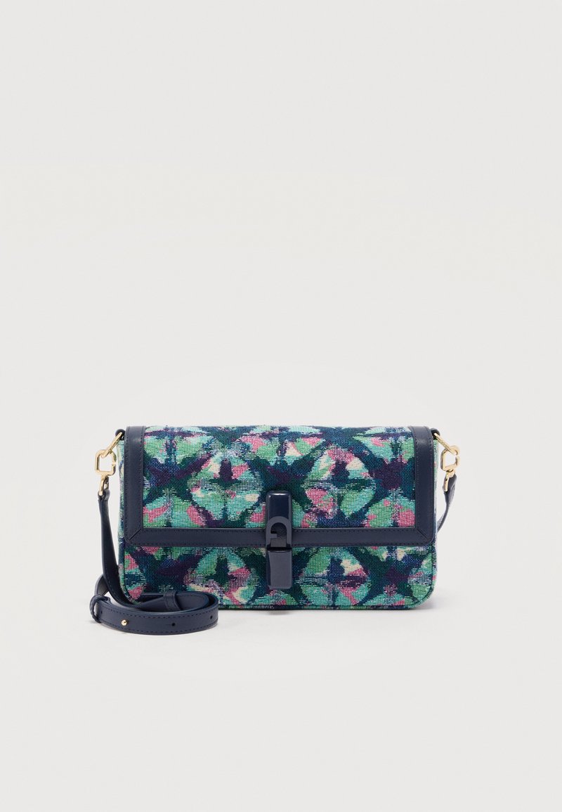 Ορθογώνια τσάντα χιαστί με σκούρες μπλε λεπτομέρειες, χρυσαφένια μεταλλικά στοιχεία και πολύχρωμο γεωμετρικό λουλουδάτο σχέδιο σε πράσινους, ροζ και ναυτικούς τόνους.