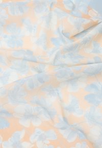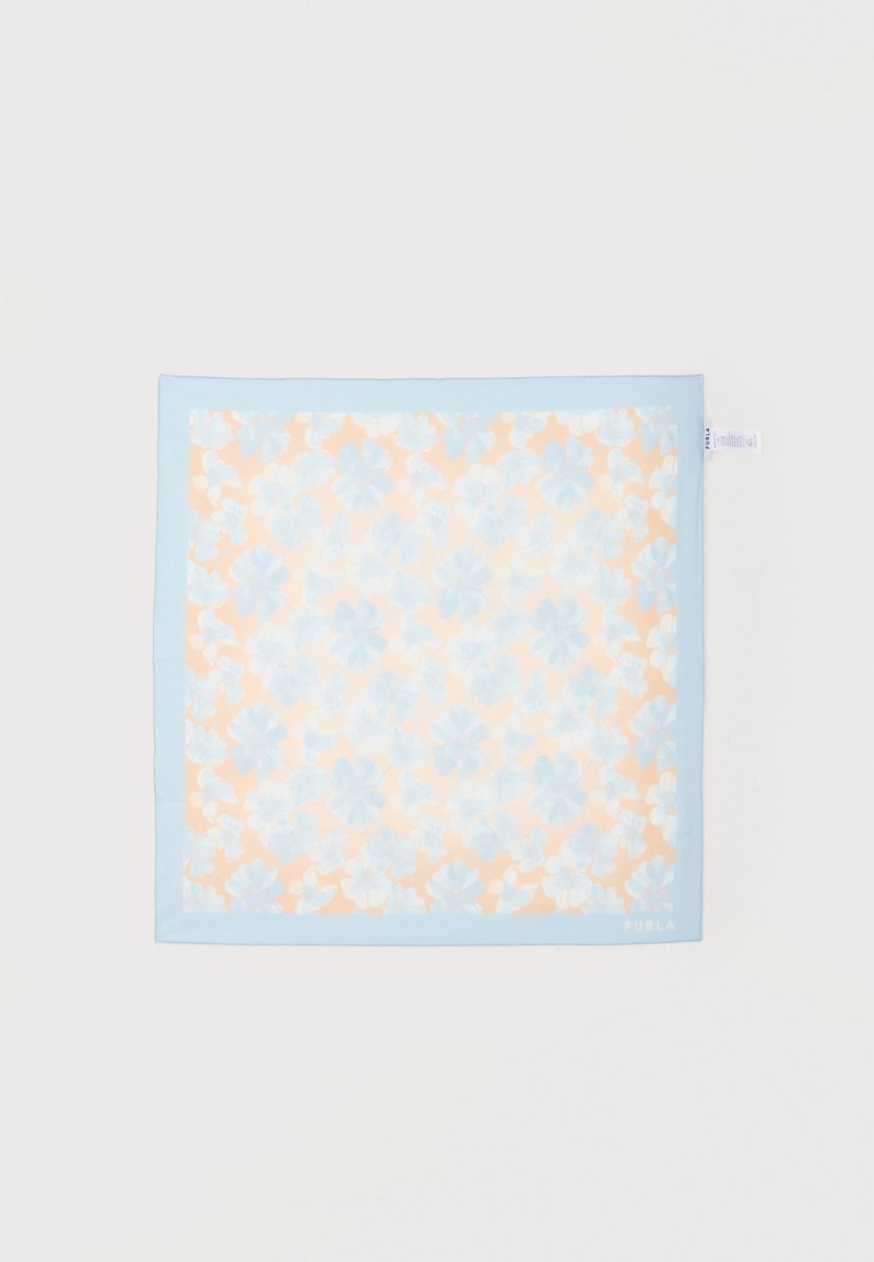 Τετράγωνο μαντήλι με γαλάζιο περίγραμμα και απαλό πορτοκαλί φόντο, με σχέδιο από ανοιχτό μπλε και λευκές ανθοκομικές μορφές.