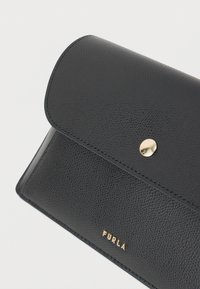 Μαύρη δερμάτινη τσάντα Furla ώμου με καπάκι, κούμπωμα με χρυσό κουμπί και μακρύ λουρί σε λευκό φόντο.