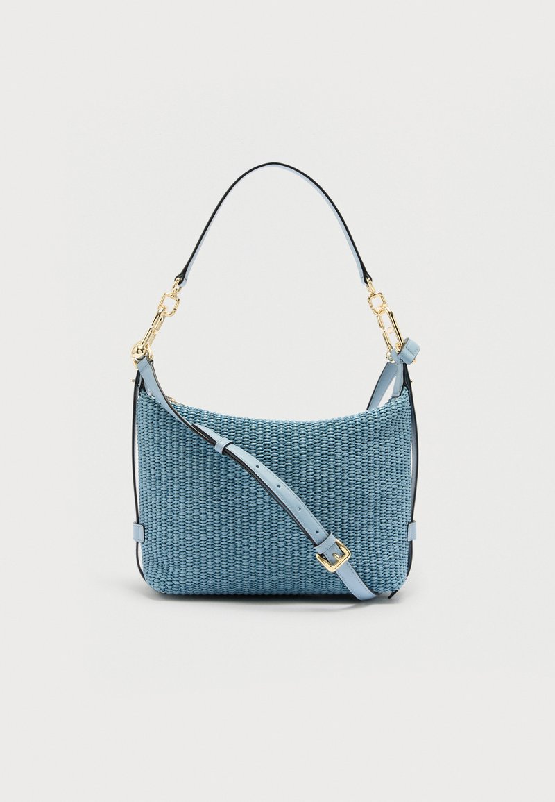 Μπλε υφαντή τσάντα χειρός με ρυθμιζόμενο ιμάντα ώμου, χρυσά μεταλλικά στοιχεία και κοντό χερούλι, πάνω σε απλό λευκό φόντο.