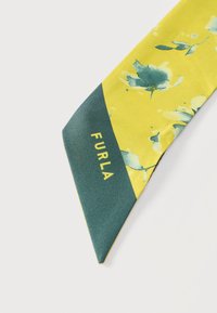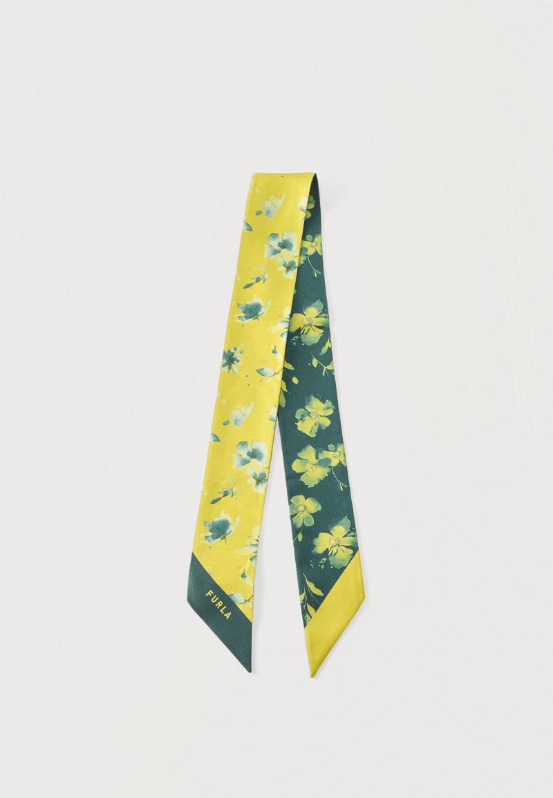 Λεπτό μεταξωτό μαντήλι με κίτρινα και σκούρα πράσινα λουλουδένια σχέδια, μυτερά άκρα και το κείμενο "FURLA" σε μια άκρη.