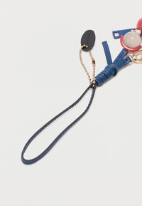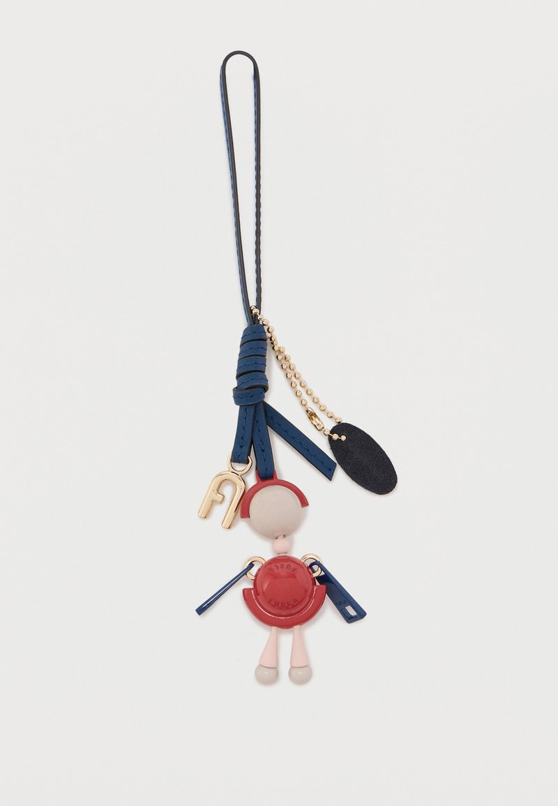 Μπρελόκ με μικρή φιγούρα κούκλας που φοράει κόκκινο φόρεμα, μπλε δερμάτινο λουρί, χρυσό κούμπωμα και χρυσή αλυσίδα με μαύρη ετικέτα.