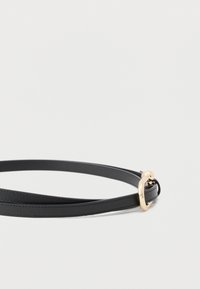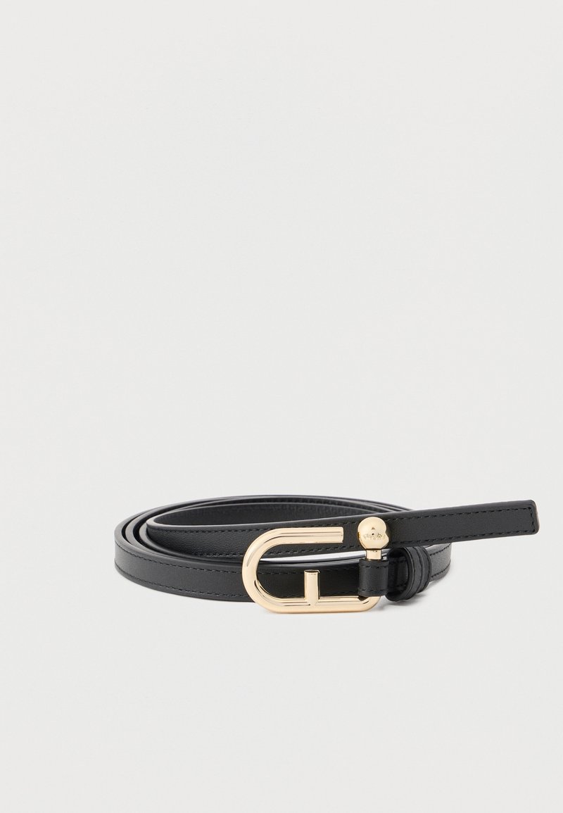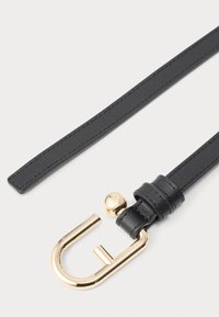 Μαύρη λεπτή δερμάτινη ζώνη τυλιγμένη με λαμπερή χρυσή οβάλ αγκράφα σε απλό φωτεινό φόντο.