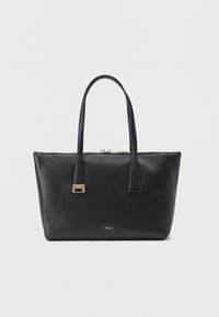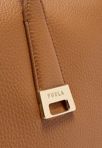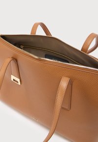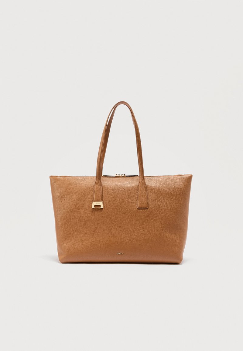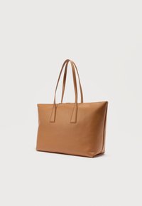 Τσάντα ώμου σε ταμπά δέρμα με διπλές λαβές, μεταλλικά στοιχεία σε χρυσό τόνο και μικρό ανάγλυφο όνομα μάρκας στο κέντρο μπροστά.