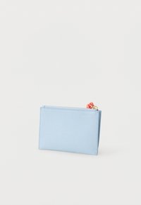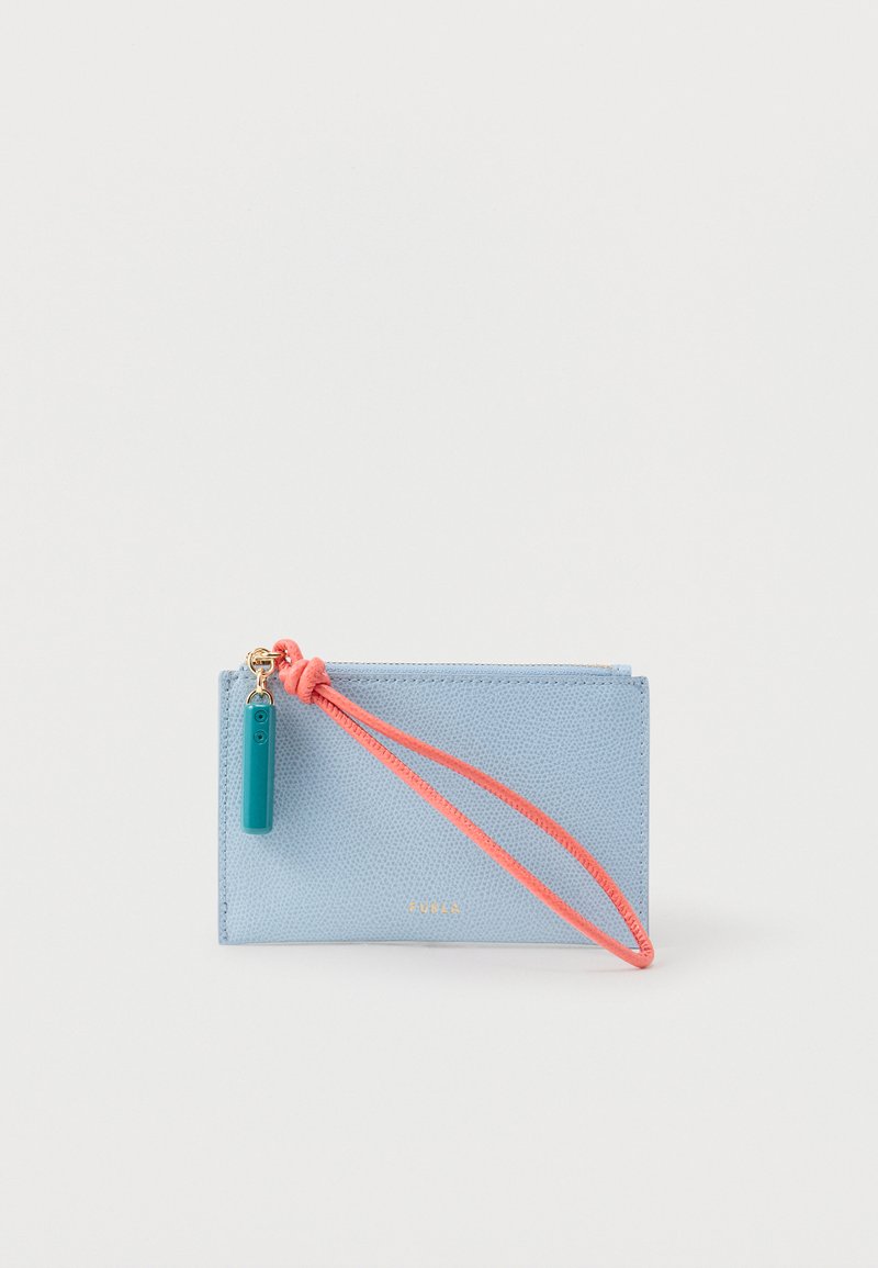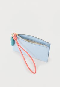 Πορτοφόλι από ανάγλυφο δερμάτινο σε ανοιχτό γαλάζιο, με μικρό χρυσό λογότυπο, ροζ κοραλί λουράκι καρπού και τσάιλ πράσινο διακοσμητικό στη φερμουάρ.