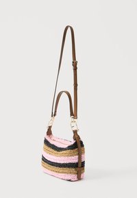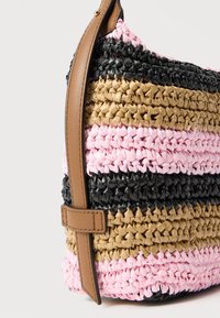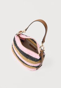 Υφαντή τσάντα χειρός με οριζόντιες ρίγες σε ροζ, μαύρο και ταμπά χρώμα, με λουράκι ώμου από ταμπά δέρμα και χρυσές αλυσίδες διακοσμητικά.