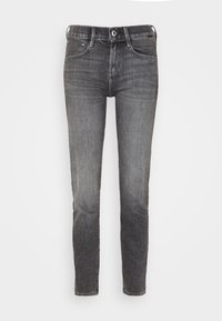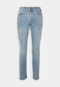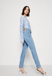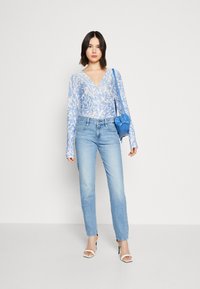 Γαλάζιες τζιν παντελόνες με ίσια γραμμή, πέντε τσέπες και διακριτική φθορά, σε συνδυασμό με λευκά ανοιχτό toe τακούνια.