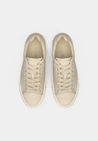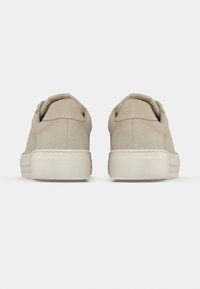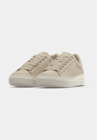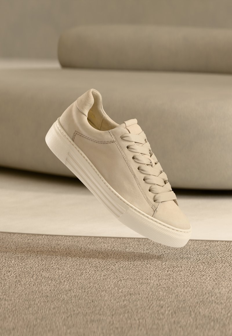 Μπεζ δερμάτινο αθλητικό παπούτσι με επίπεδα κορδόνια και υφασμένη ελαστική σόλα. Στρογγυλερή μύτη, ελάχιστες ραφές και χαμηλό προφίλ σχεδίασης.