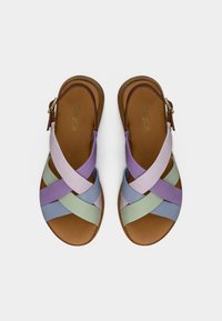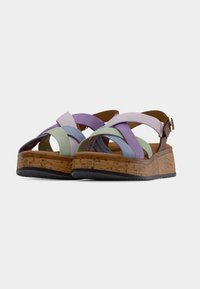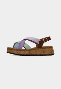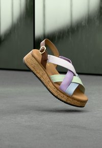 Πολύχρωμο τρίγωνο σανδάλι με λουριά που διασταυρώνονται, με λωρίδες σε μωβ, ανοιχτό μπλε και πράσινο. Μεσόσολα από φελλό και καφέ λουρί αστραγάλου με αγκράφα.