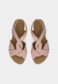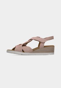 Ροζ σανδάλι σε αποχρώσεις του ρουζ με σχεδιασμό σταυρωτού λουριού, απαλή υφή, χαμηλό τακούνι σε σφήνα και λευκή λαστιχένια σόλα, με ουδέτερο φόντο.