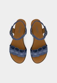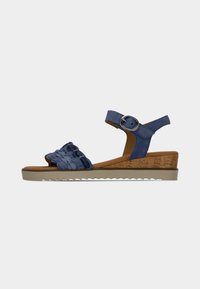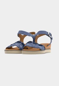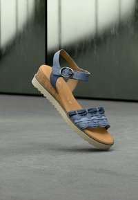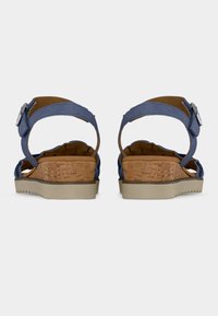Μπλε σανδάλι με στρωματοποιημένη λεπτομέρεια βολάν, ενδιάμεση σόλα από φελλό και ρυθμιζόμενο λουράκι στον αστράγαλο. Υφή στη σόλα για καλύτερο κράτημα, εσωτερική επένδυση λεία.