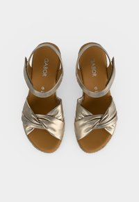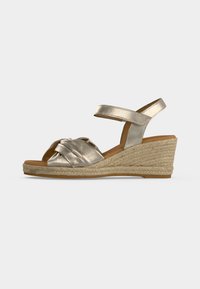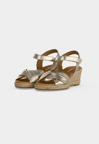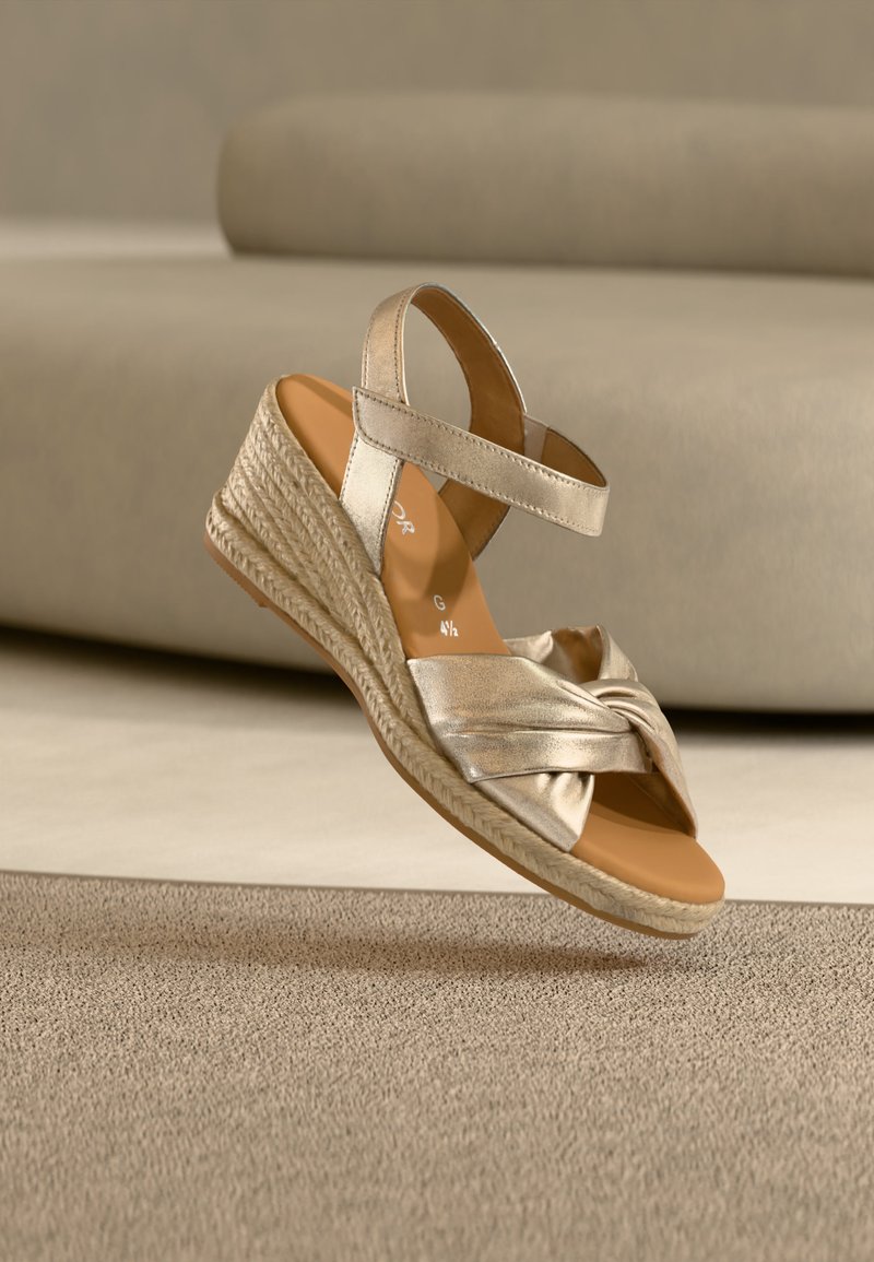 Μπεζ πλατφόρμα σφήνας με πλεκτή βάση, μπροστινό λουρί δεμένο σε κόμπο και λουρί στο αστράγαλο, παρουσιάζεται σε ουδέτερη υφασμάτινη επιφάνεια.