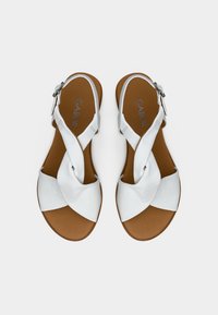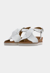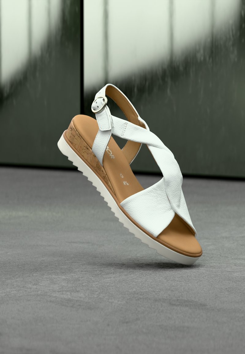 Λευκό δερμάτινο σανδάλι με σταυρωτούς ιμάντες, μεσαία σόλα από φελλό και λευκή λαστιχένια σόλα. Διαθέτει ασημένια αγκράφα στη λουράκι του αστραγάλου.