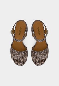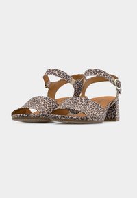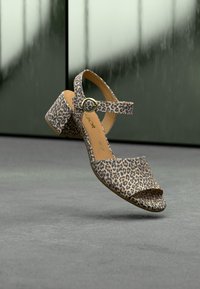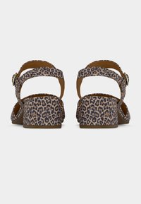 Πέδιλα με ψηλό τακούνι και λεοπάρ σχέδιο, με στρογγυλεμένη μύτη, λουράκι στον αστράγαλο και διακοσμητική αγκράφα. Υλικό από συνθετικό δέρμα με υφασμένο φινίρισμα.