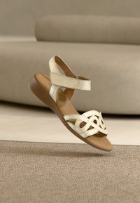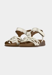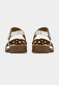 Χρυσό μεταλλικό σανδάλι με ανοιχτά δάχτυλα, ρυθμιζόμενα λουριά και διακοσμητικό σχέδιο με κοψίματα. Μαλακή σόλα σε καφέ χρώμα, επίπεδη φτέρνα.