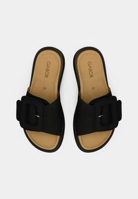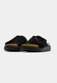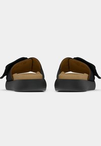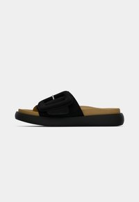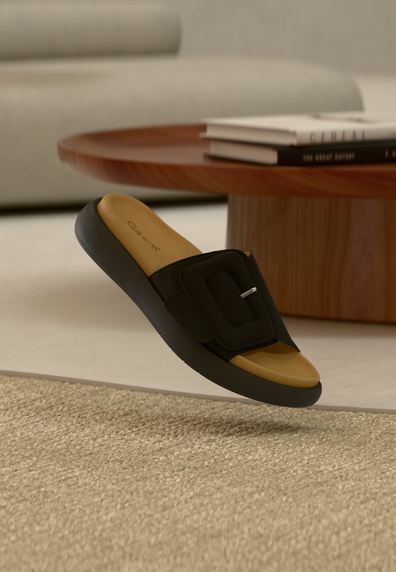 Μαύρο σανδάλι τύπου slide με φαρδιά λουρί που διαθέτει τετράγωνη αγκράφα, ταμπά πάτος και υφασμένη σόλα, που αιωρείται πάνω από υφαντό χαλί.