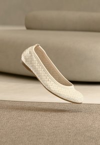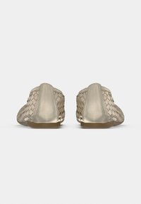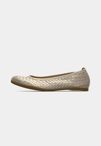 Πλεκτό, μεταλλικό χρυσό μπαλαρίνι με στρογγυλερή μύτη και μαλακό εσωτερικό, με ευέλικτη σόλα και υφή στην επιφάνεια. Επιπλέει πάνω από το χαλί.