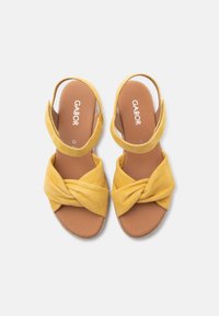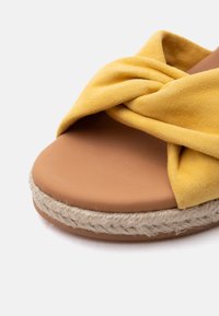 Κίτρινο σανδάλι με χοντρό τακούνι από σουέντ, με λουράκι στον αστράγαλο και πλεκτή σόλα από τζούτ, παρουσιασμένο σε λευκό φόντο.