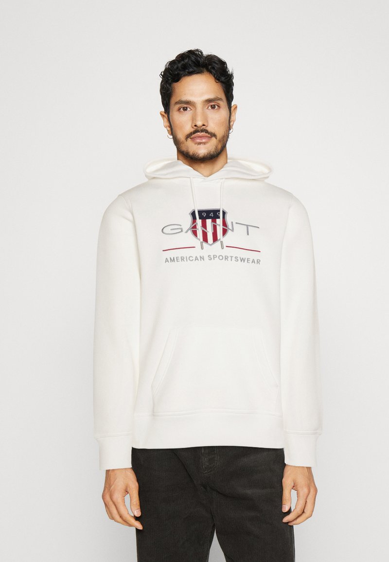 Άνδρας φοράει λευκό φούτερ με κουκούλα με το λογότυπο GANT American Sportswear, στέκεται μπροστά σε απλό ανοιχτό φόντο, με τα χέρια χαλαρά στο πλάι.