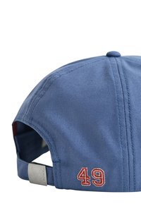 Νεαρός άνδρας που φοράει μπλε καπέλο бейсбол με την επιγραφή «GANT NH-49», τζιν μπουφάν πάνω από λευκό μπλουζάκι, κοιτάζοντας μπροστά σε απλό φόντο.