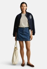 Γυναίκα με μακριά σκούρα μαλλιά, φοράει μια μπεζ μπλούζα με κοντά μανίκια και μια μπλε τζιν φούστα με χρυσά κουμπιά στις τσέπες.