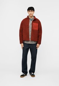 Νέος άντρας που φοράει κόκκινο φλις μπουφάν με φερμουάρ και υφή, πάνω από ένα καρό πουκάμισο και σκούρο τζιν, στέκεται μπροστά σε απλό λευκό φόντο.