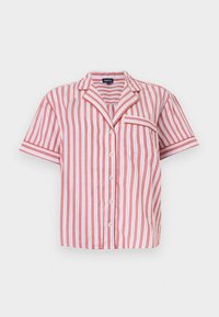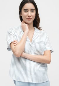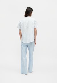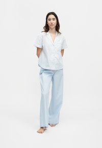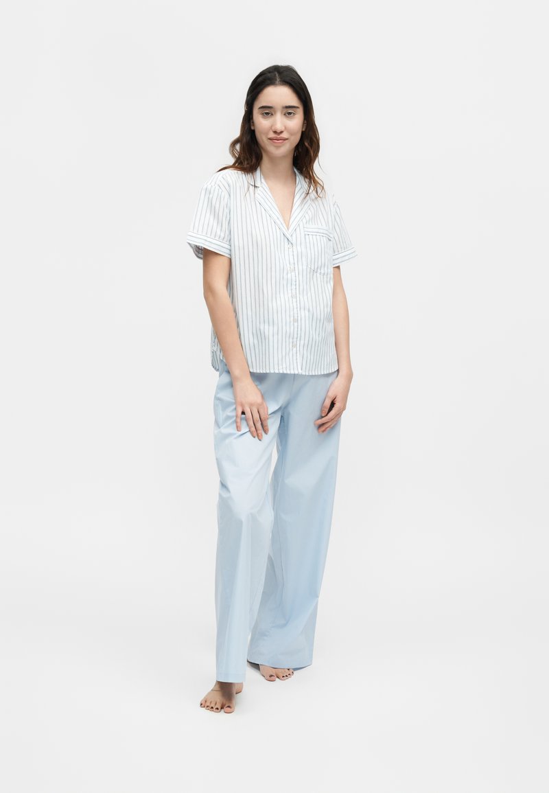 Γυναίκα που στέκεται ξυπόλυτη, φοράει ανοιχτό μπλε φαρδιά παντελόνια και λευκό κοντομάνικο πουκάμισο με λεπτές κάθετες ρίγες σε απλό φόντο.