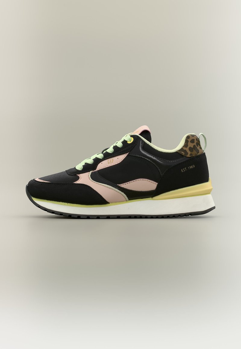 Μαύρο και ροζ αθλητικό παπούτσι με απαλές πράσινες κορδόνια, ένθετο με λεοπάρ σχέδιο στη φτέρνα και λευκή σόλα πάνω σε ουδέτερο φόντο.