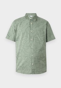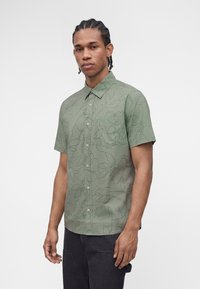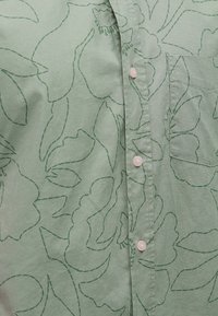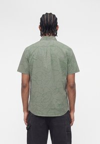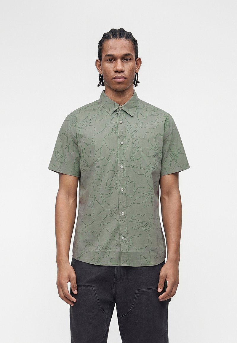 Νεαρός άνδρας με πλεξούδες, που φοράει πράσινο πουκάμισο με κοντά μανίκια και διακριτικό λουλουδένιο σχέδιο και μαύρο παντελόνι σε λευκό φόντο.