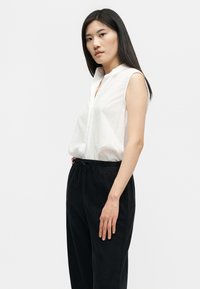 Γυναίκα που φοράει μαύρο παντελόνι με φαρδιά πόδια και ελαστική μέση και λευκό αμάνικο πουκάμισο με κουμπιά, συνδυασμένο με σανδάλια με τετραγωνισμένο δάχτυλο.