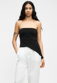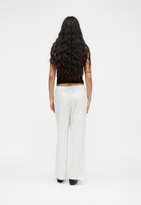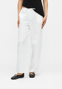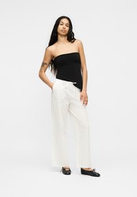 Λευκό φαρδύ παντελόνι με κεντήματα λουλουδιών και ελαστική μέση με κορδόνι, φορεμένο με μαύρο τοπ και μαύρες μπαλαρίνες.