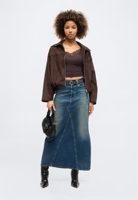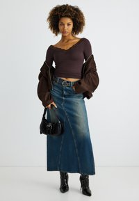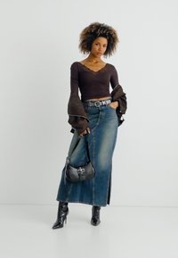 Γυναίκα με σγουρά μαλλιά φοράει σκούρο καφέ μπλούζα λαιμόκοψη V με δαντελωτό τελείωμα και ζώνη με τρουκς πάνω από μπλε τζιν φούστα.