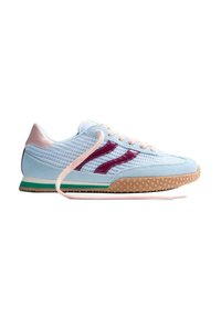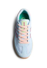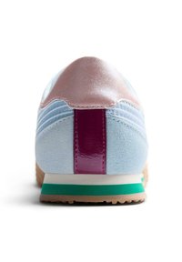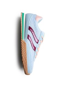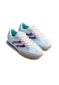 Αθλητικό παπούτσι ανοιχτού μπλε χρώματος με αυτί από σουέντ και δίχτυ, μοβ λεπτομέρειες, ροζ κορδόνια, υφή στη σόλα από καουτσούκ και πράσινη ρίγα στη μεσαία σόλα.