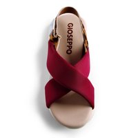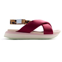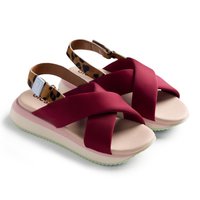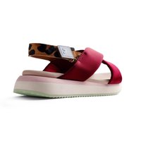 Πέδιλο ανοιχτού τύπου με φαρδιές κόκκινες λουρίδες σε σχήμα σταυρού, παχιά μπεζ σόλα και λουρί αστραγάλου με λεοπάρ σχέδιο και κούμπωμα με αγκράφα.