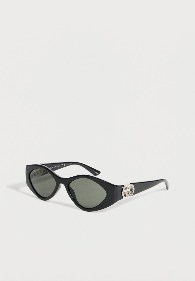 Μαύρα οβάλ γυαλιά ηλίου με σκούρους φακούς και διακοσμητικό με στρας διπλό λογότυπο G της Gucci στο βραχίονα, κατασκευασμένα στην Ιαπωνία.