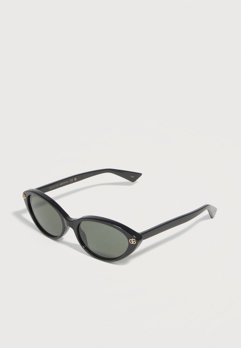 Μαύρα γυαλιά ηλίου Gucci σε σχήμα ματιού γάτας με σκούρους φακούς και χρυσά λογότυπα GG στις μπροστινές γωνίες, εμφανιζόμενα σε λευκό φόντο.