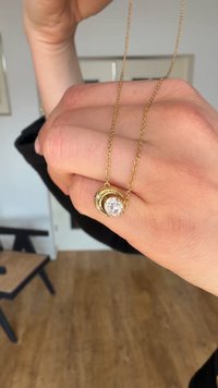 Λεπτό χρυσό κολιέ με αλυσίδα και μενταγιόν σε σχήμα ημισελήνου που περιβάλλει μια στρογγυλή διαφανή πέτρα και μια μικρή λεπτομέρεια αστέρι κοντά στο κούμπωμα.