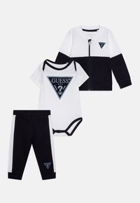 Σετ ρούχων μωρού τριών τεμαχίων σε κόκκινο και άσπρο χρώμα. Περιλαμβάνει ένα bodysuit με κοντό μανίκι, μπουφάν με φερμουάρ και παντελόνι, όλα με τριγωνικό λογότυπο της μάρκας.