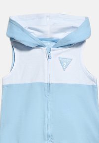 Νήπιο που φοράει λευκή και γαλάζια στολή Guess με γιλέκο με κουκούλα, παντελόνια και λευκά αθλητικά παπούτσια, στέκεται μπροστά σε λευκό φόντο.