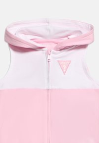 Νήπιο που στέκεται με ροζ και λευκή εμφάνιση Guess, με αμάνικο φούτερ με κουκούλα, ταιριαστά παντελόνια και λευκά αθλητικά παπούτσια, μπροστά σε ένα απλό φόντο.