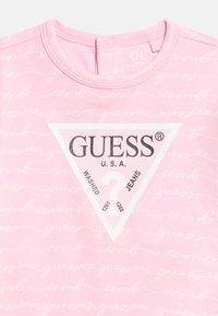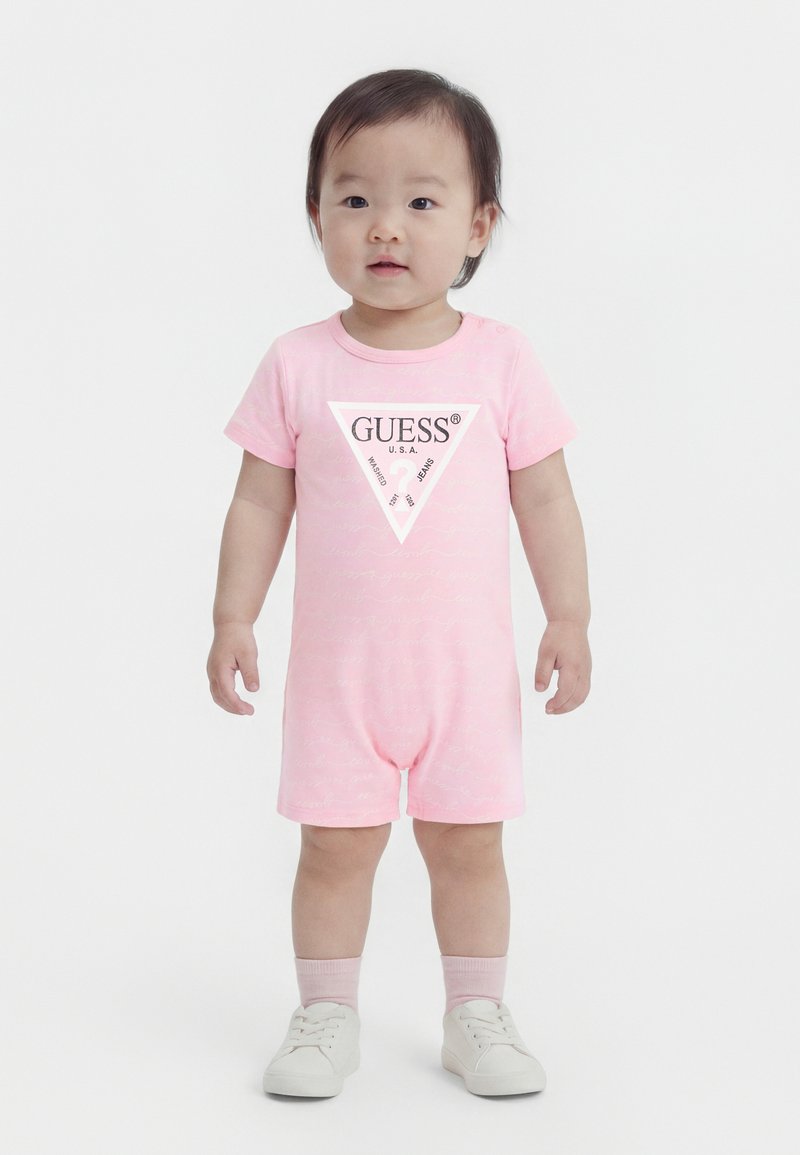 Νήπιο όρθιο, φοράει ροζ φορμάκι Guess με κοντά μανίκια, ροζ κάλτσες και λευκά αθλητικά παπούτσια, με φόντο μια απλή λευκή επιφάνεια.