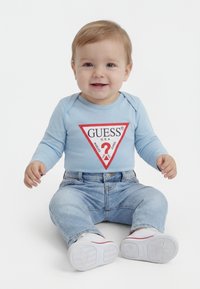 Χαμογελαστό μωρό με ανοιχτό μπλε μακρυμάνικο πουκάμισο με κόκκινο λογότυπο Guess, ανοιχτό τζιν παντελόνι και λευκά αθλητικά καθισμένο σε λευκή επιφάνεια.