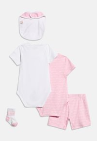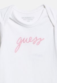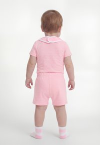 Νήπιο που φοράει ροζ σύνολο Guess με σαλιάρα, σορτς και λευκές κάλτσες, όρθιο μπροστά σε απλό λευκό φόντο.