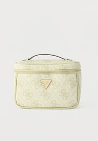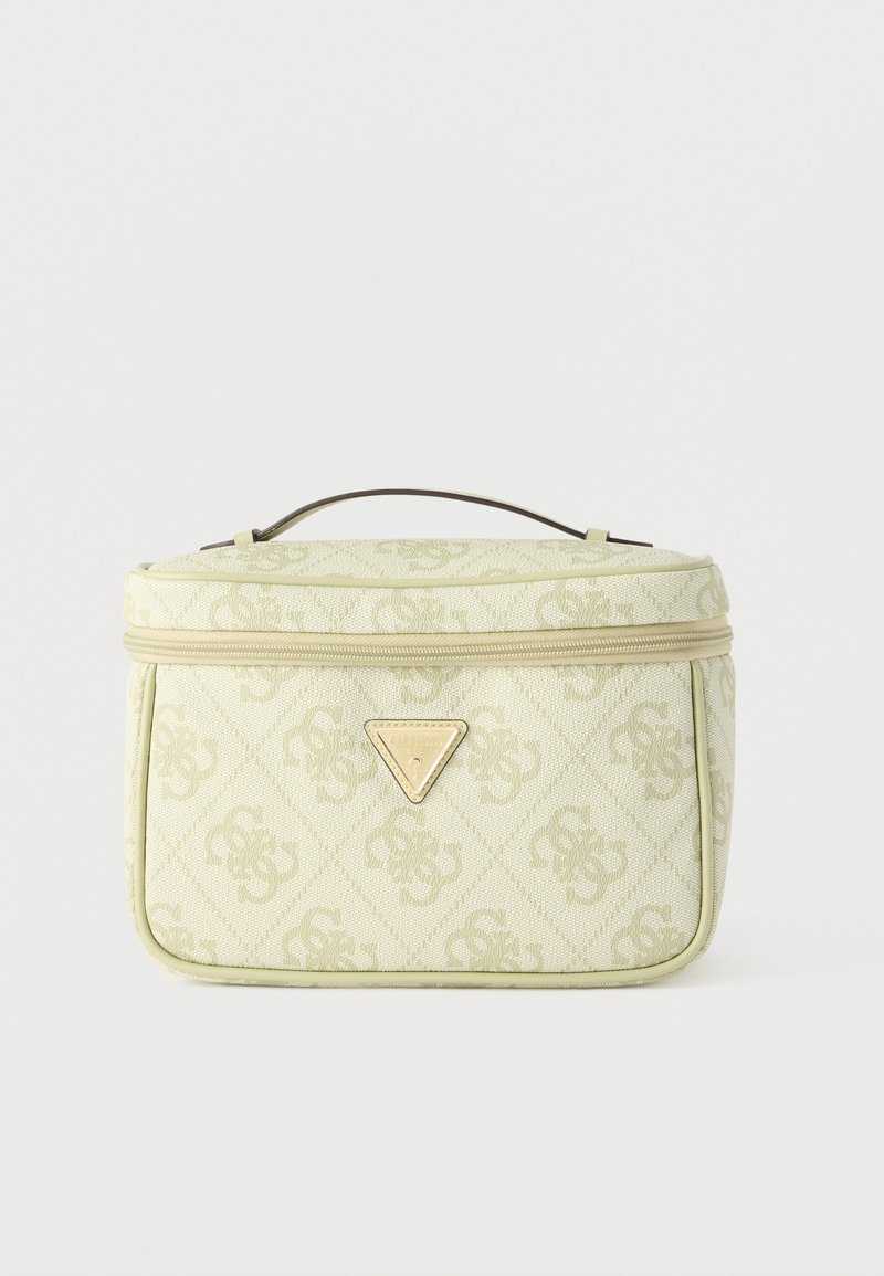 Φωτεινή μπεζ ορθογώνια καλλυντική τσάντα με ραμμένο σχέδιο, επάνω φερμουάρ, χερούλι και κεντρική τριγωνική πλακέτα με το λογότυπο Guess.