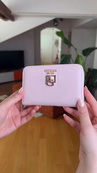Μπεζ πορτοφόλι με φερμουάρ γύρω-γύρω από λείο υλικό, με χρυσό λογότυπο της μάρκας «GUESS EST 1981» και ραμμένες λεπτομέρειες.